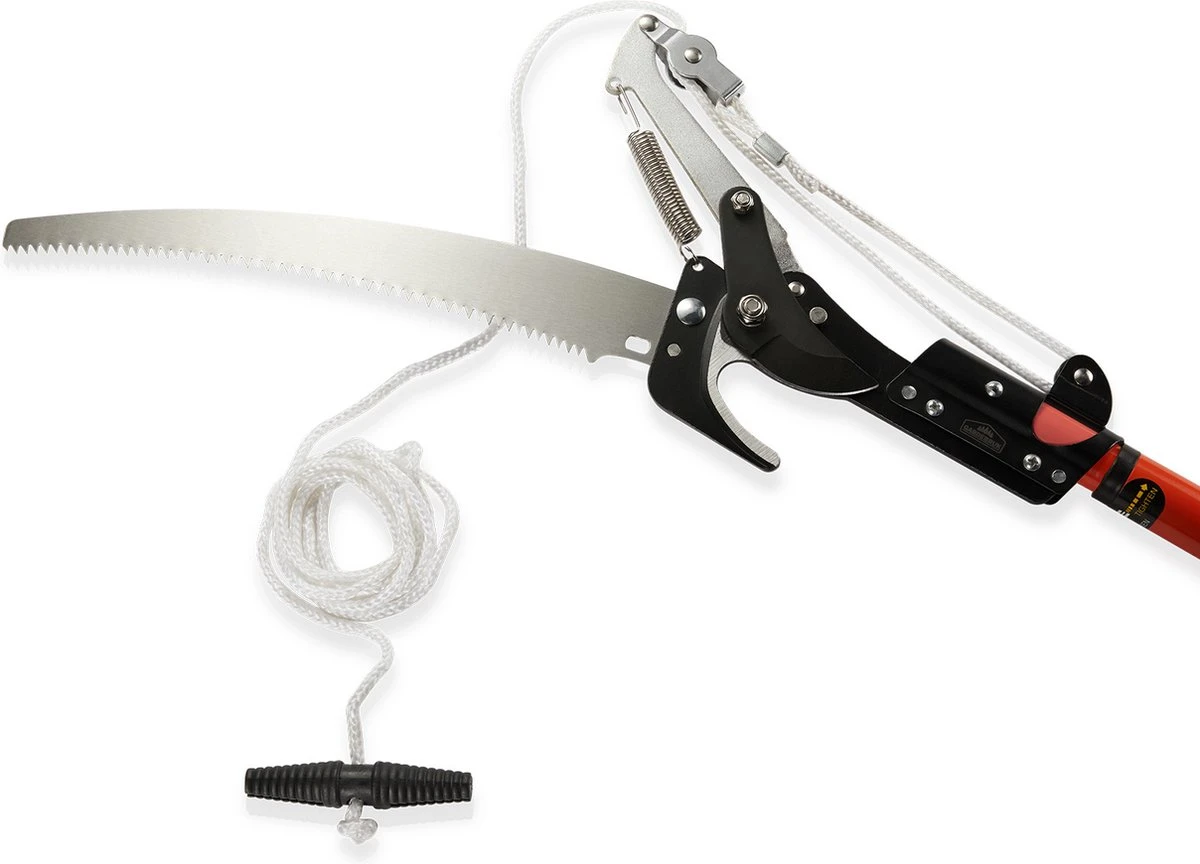 Voor dikkere takken ondersteunt de zaagfunctie jou met zijn 360 mm lange zaagblad. Voor dunnere takken tot 30 mm diameter is het schaarblad met antikleefcoating de perfecte keuze. De met rubber beklede handgreep van de telescoopsteel zorgt voor een goede grip en met behulp van het trekkoord met dwarsgreep heb je een optimale krachtoverbrenging bij het snoeien.